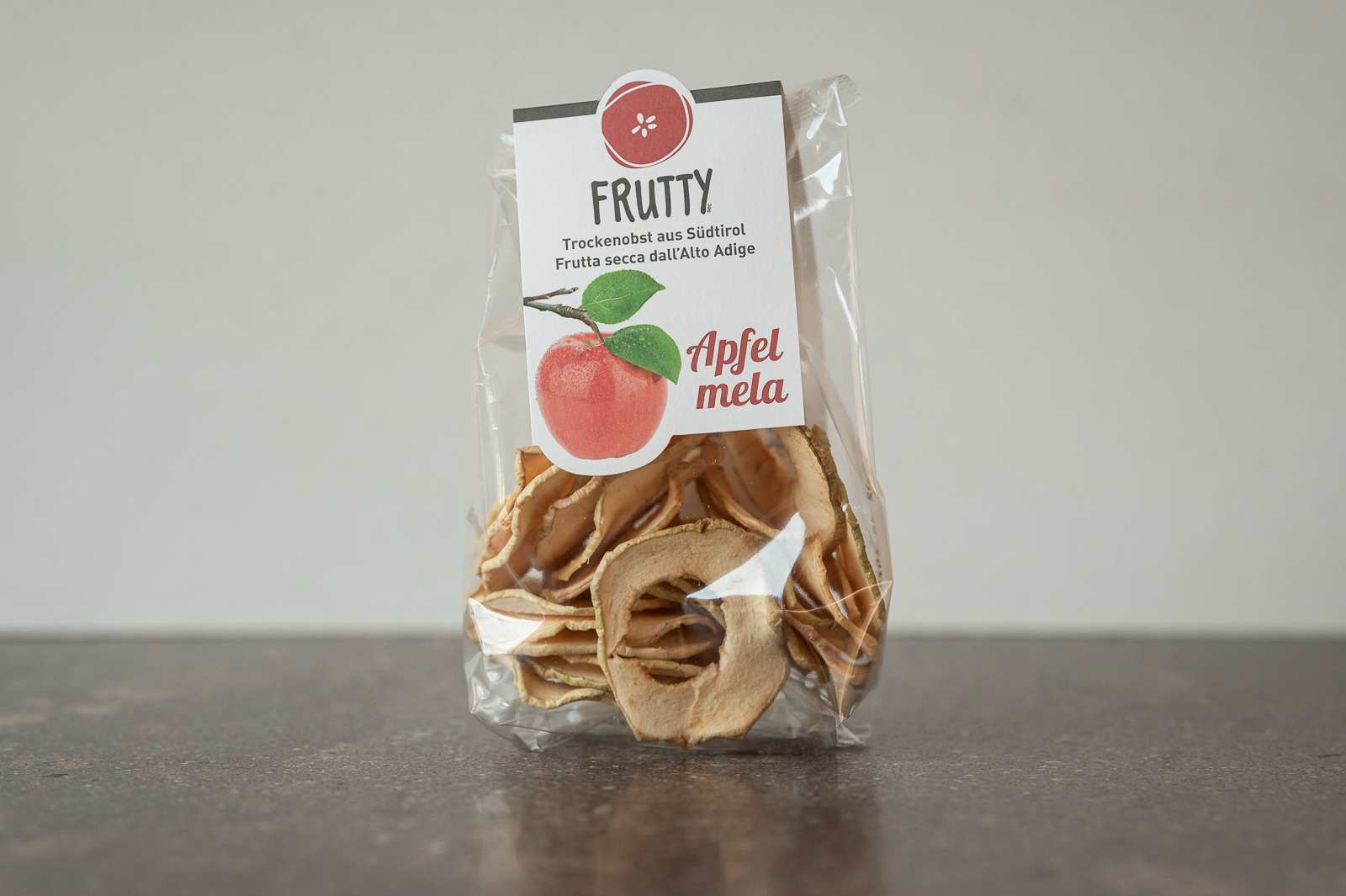 Frutty – la tentazione fruttata dell'Alto Adige: Sottili anelli di mela croccanti, arricchiti dalla dolcezza naturale, per uno spuntino leggero e rinfrescante.