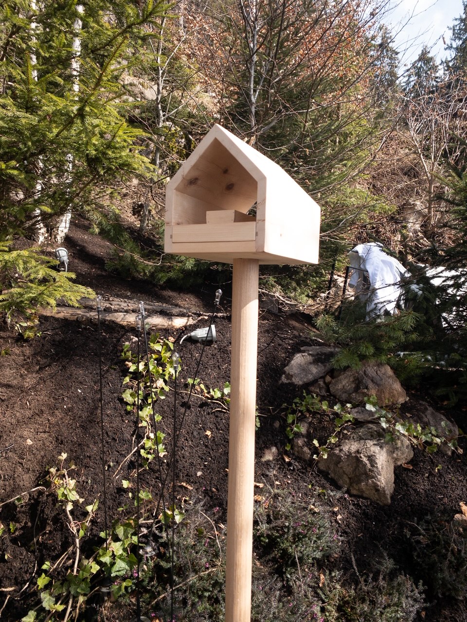 La casa per uccelli MM - fatta a mano dal nostro falegname. La forma ricorda la casa del proprietario della MIRAMONTI. Il legno è resistente alle intemperie e si adatta ad ogni giardino progettato con amore. Con ogni vendita di una casetta per uccelli 10,00€ saranno donati all'Associazione Protezione Uccelli Alto Adige (AVK). Si tratta di un'associazione volontaria che da decenni si prende cura della nostra variegata avifauna. Siamo felici di iniziare questo progetto ambientale insieme a voi. Viene fornito con un palo di legno alto 1,80 m e un cassetto per il cibo estraibile. Dimensioni: lunghezza 28 cm, larghezza 20 cm, altezza 22 cm, altezza del palo di legno circa 180 cm.